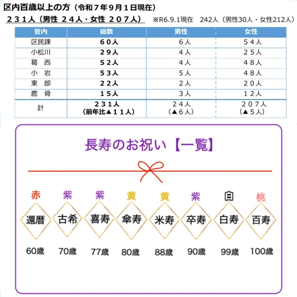 2025.09.11 未分類 江戸川区の百歳以上の数 9月1日時点の江戸川区の百歳以上の方の人数について報告がありました☆ 圧倒的に女性が多いですね!! Tweet Share 未分類 江戸川区花火大会 実績報告前の記事 江戸川区長 定例記者会見次の記事