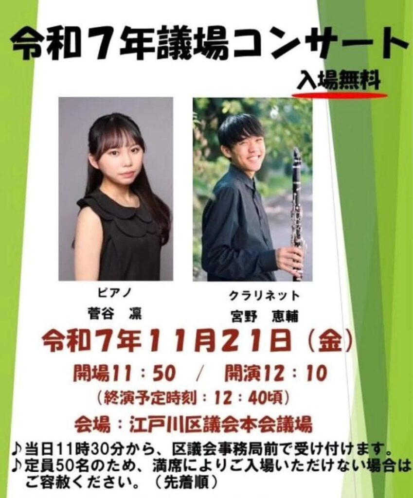 江戸川区議会の令和7年第4回定例会がスタートする明日、区議会本会議場において、コンサートを開催します♪