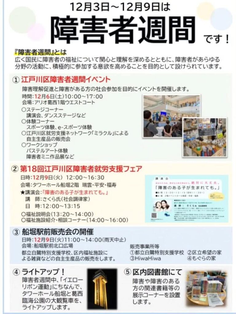 平成16年6月障害者基本法により「国際障害者デー」である12月3日から「障害者の日」である12月9日までの1週間を『障害者週間』と定められました。
